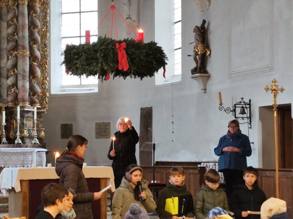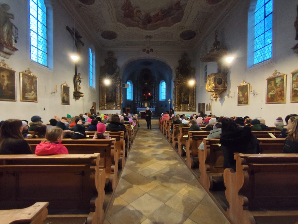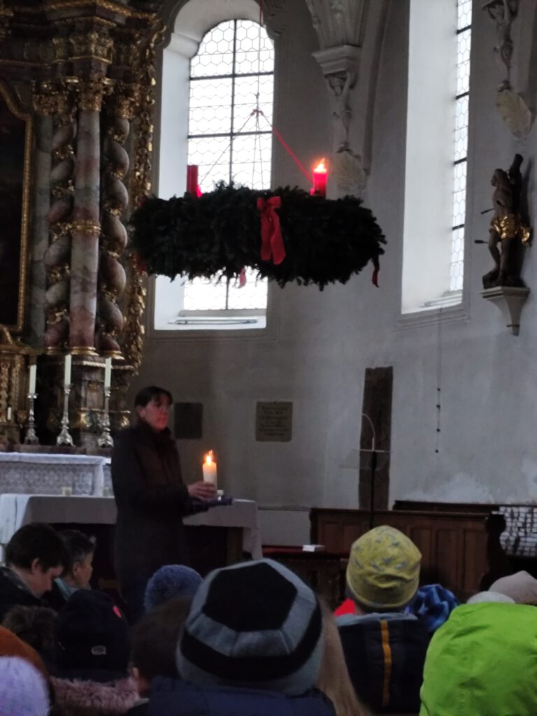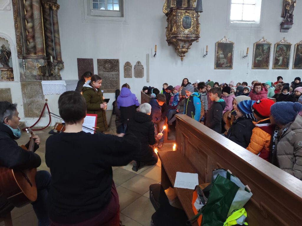 Auch wir haben in der dunklen Kirche eine Kerze angezündet, um die Kraft dieses Lichtes wahrzunehmen. Danach wurde für jede Klasse eine weitere Kerze angezündet, um sich immer daran zu erinnern, dass dies ein Zeichen für Gottes Liebe in unserer Welt ist. Denn wenn wir das Licht teilen, bekommen alle Anteil daran und dürfen es auch an andere weitergeben. Denn Jesus sagt: „Ihr seid das Licht der Welt.“