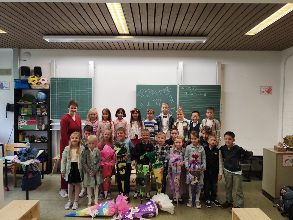 Es folgte eine erste Unterrichtsstunde im Klassenzimmer mit den beiden Klassenlehrerinnen Frau Nutz-Gesele und Frau Neumann, bei der auch eine kleine Hausaufgabe nicht fehlen durfte. Danach konnte mit der Familie der besondere Tag gefeiert und endlich die Schultüte ausgepackt werden.
