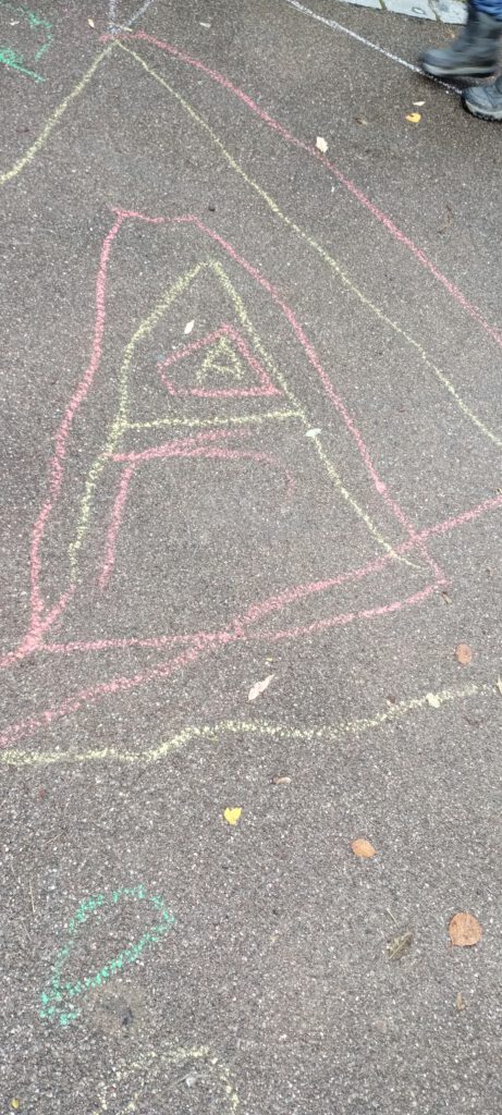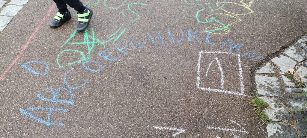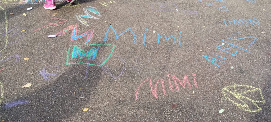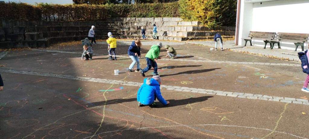 Mit großer Begeisterung schrieben die Kinder der Klasse 1a am 24.10.2025 mit viel bunter Straßenmalkreide die Ziffern und Wörter, die sie bisher gelernt hatten, auf den unteren Pausenhof.